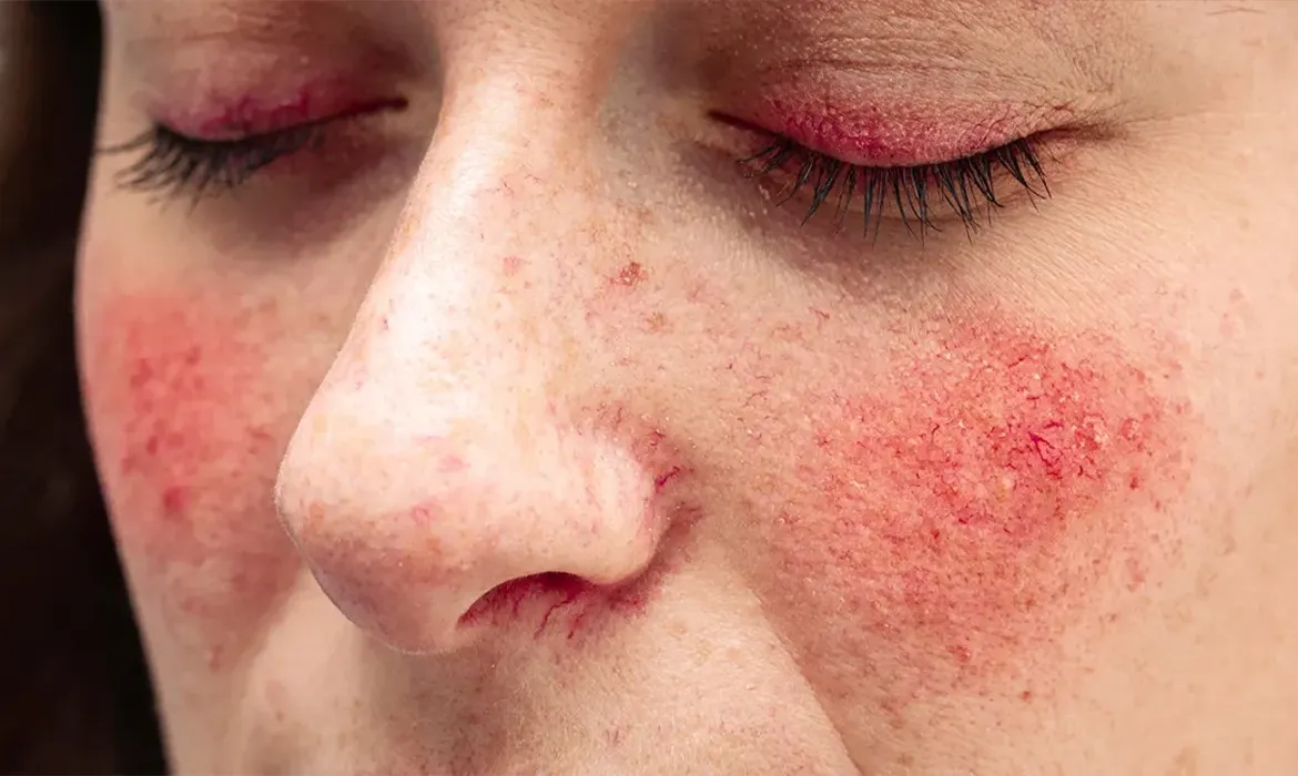 Rosacea is a chronic inflammatory skin condition that primarily affects the central face and is characterized by persistent redness (erythema), flushing, visible blood vessels (telangiectasia), papules, and pustules. It often begins after the age of 30 and is more prevalent in individuals with fair skin, though it can affect all skin types. The pathophysiology involves dysregulation of the innate immune system, overexpression of antimicrobial peptides like cathelicidin (LL-37), and abnormal vascular responses leading to neurovascular dysregulation. Triggers such as sunlight, heat, alcohol, spicy foods, stress, and even certain skincare products can exacerbate symptoms. The Demodex mite, a common skin resident, is found in higher densities in rosacea patients and may play a role in inflammation. There are four recognized subtypes: erythematotelangiectatic, papulopustular, phymatous, and ocular rosacea, each with distinct clinical features.